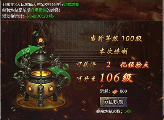 【活动内容】:开服前3天玩家每天有5次机会进行经验炼制。经验炼制是前期升级最快的途径!