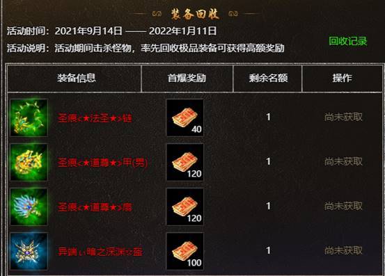 【活动内容】:活动期间击杀怪物,率先回收极品装备可获得高额奖励!