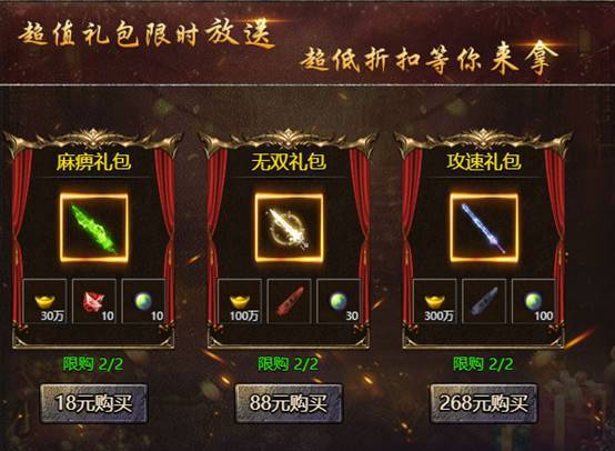 玩家可花费268元购买 攻速 礼包 ,可额外增加人物攻速400,杀人越货不可缺少的利器。