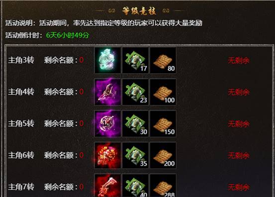 【活动内容】:活动期间,玩家达到相应的等级或者转生条件,可以领取丰厚大礼,奖励有限,先到先得!