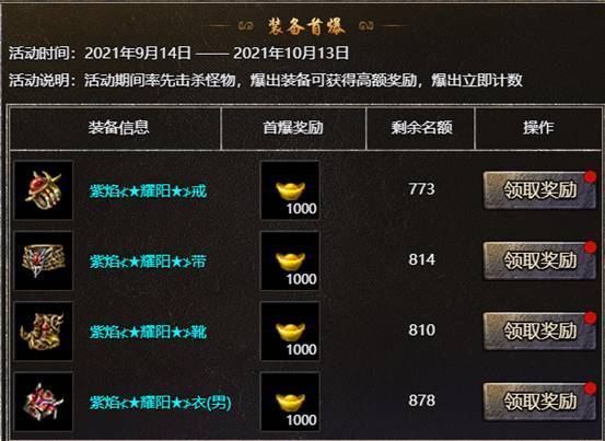【活动内容】:活动期间率先击杀怪物,爆出装备可获得高额奖励,爆出立即计数,看谁白嫖的奖励最多!