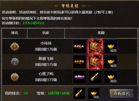 【活动内容】:活动结束时,玩家等级榜前10的玩家可以获得大量奖励,同样等级先达到的排名在前!
