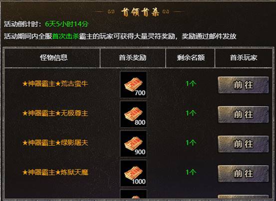 【活动内容】:活动期间内全服首次击杀霸主的玩家可获得大量灵符奖励,奖励通过邮件发放。